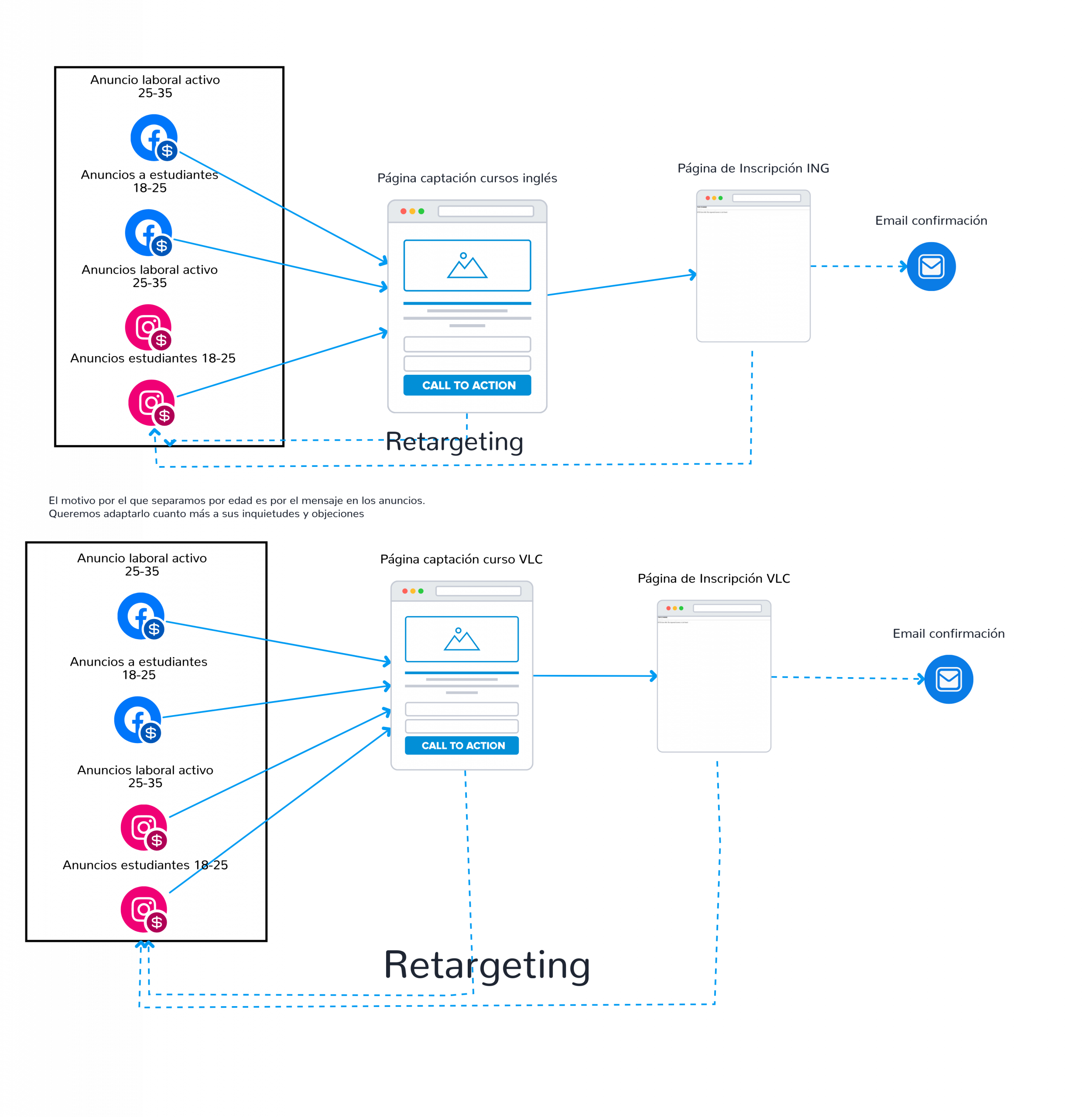 A partir de ese estudio, elaboré un plan de distribución presupuestaria entre campañas SEM (Google Ads) y redes sociales, equilibrando inversión entre tráfico de búsqueda cualificado y campañas visuales de atracción. En paralelo, desarrollé tres embudos automatizados de captación, con secuencias de mensajes que acompañaban al usuario desde el interés inicial hasta la matrícula, personalizando la comunicación según el idioma y el nivel del curso.